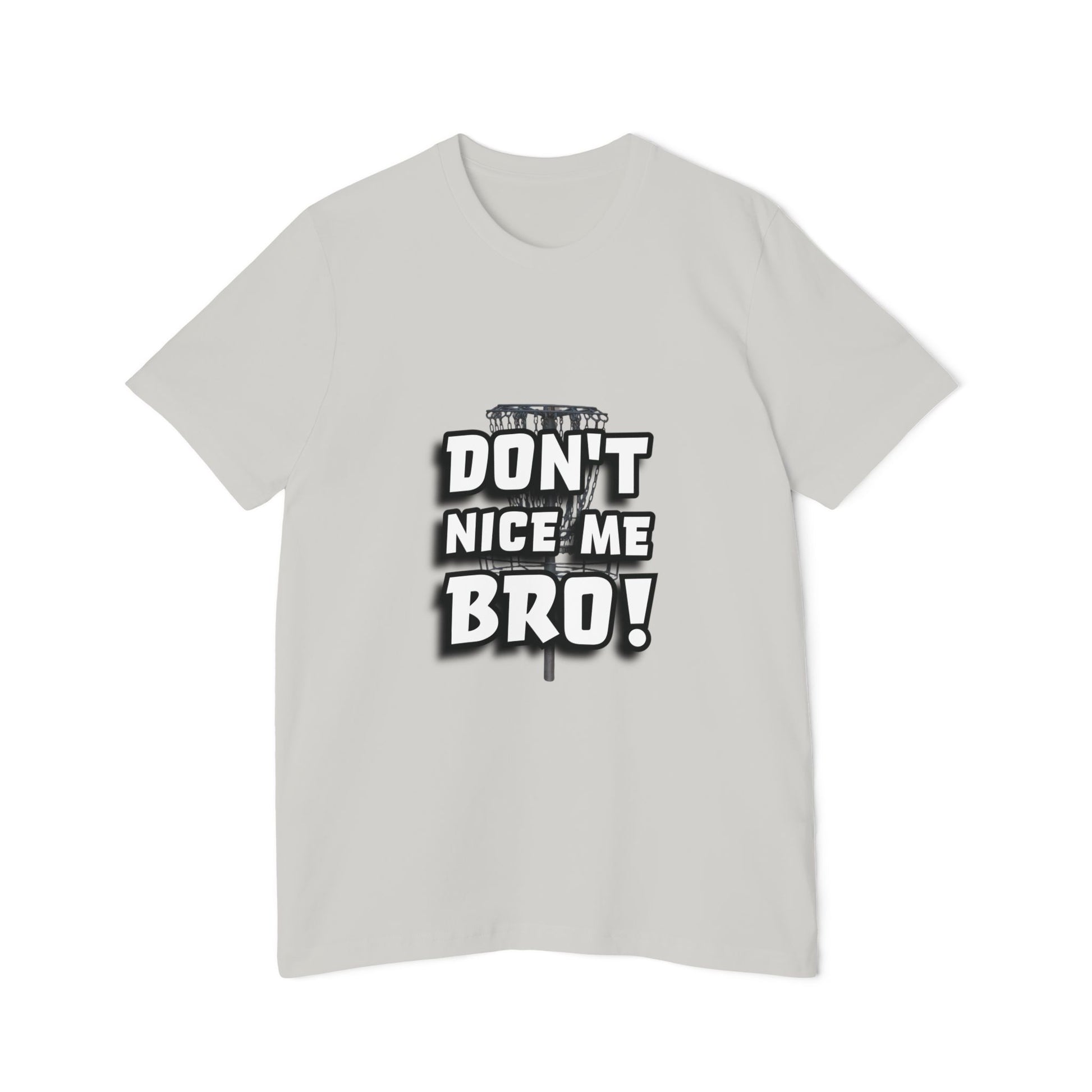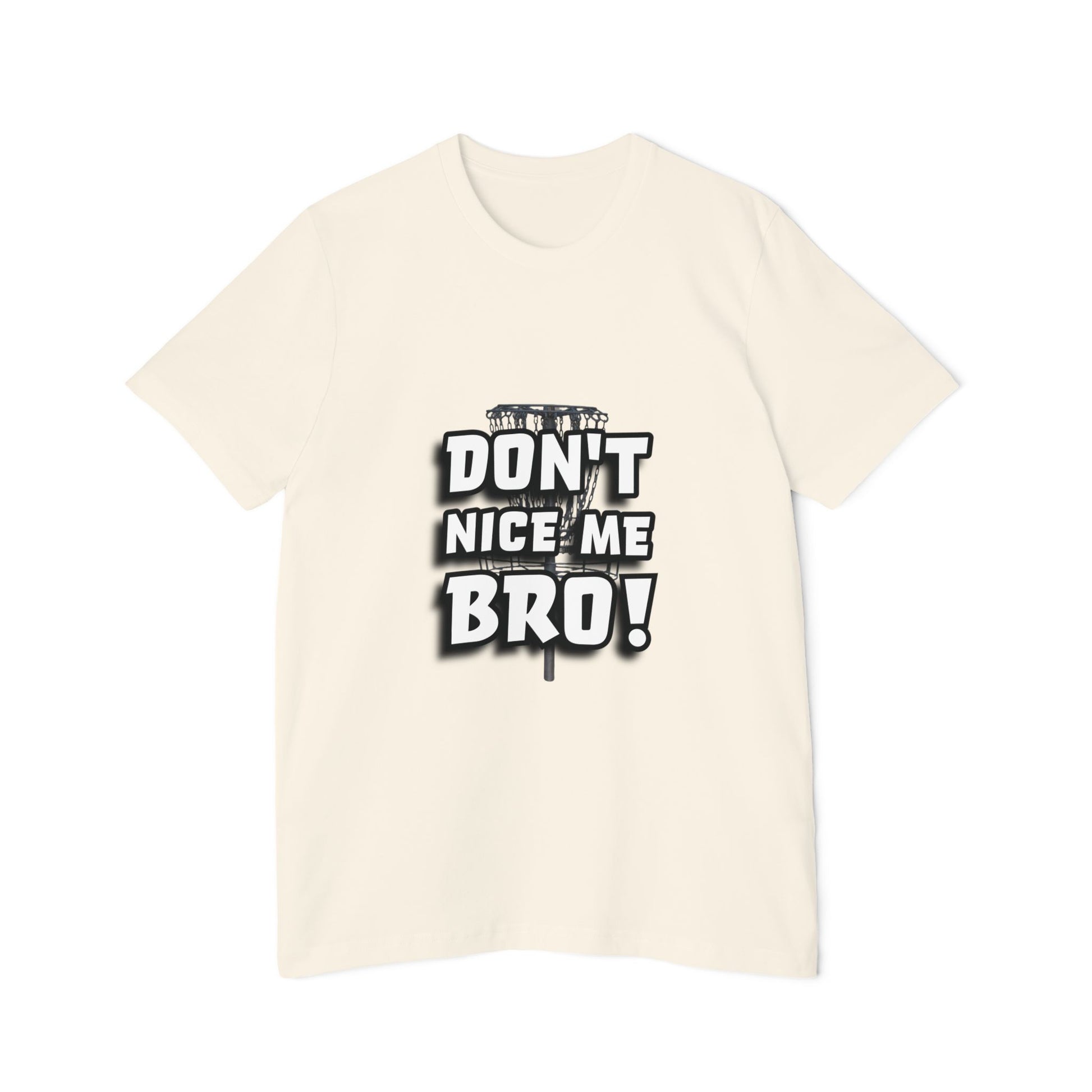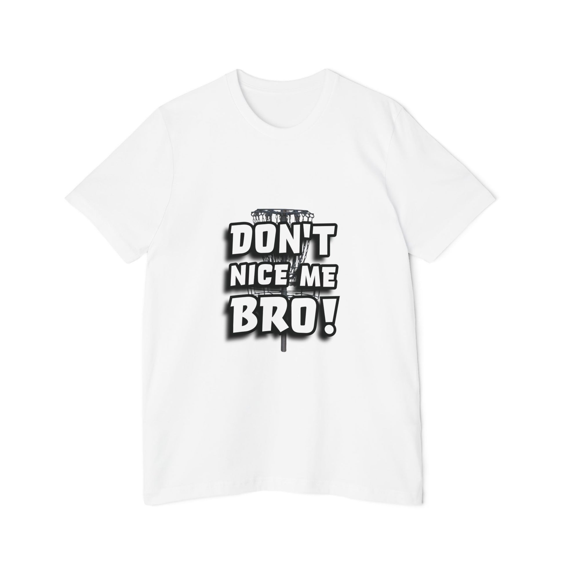 This tee brings disc golf humor front and center with the bold phrase “DON’T NICE ME BRO!” in large, stylized white and black lettering. A faint image of a disc golf basket adds subtle texture behind the words, giving it that on-the-course edge. Perfect for players who know the jinx is real, say “nice shot” too soon, and you might just curse it! A must-have for any disc golfer with a sense of humor.