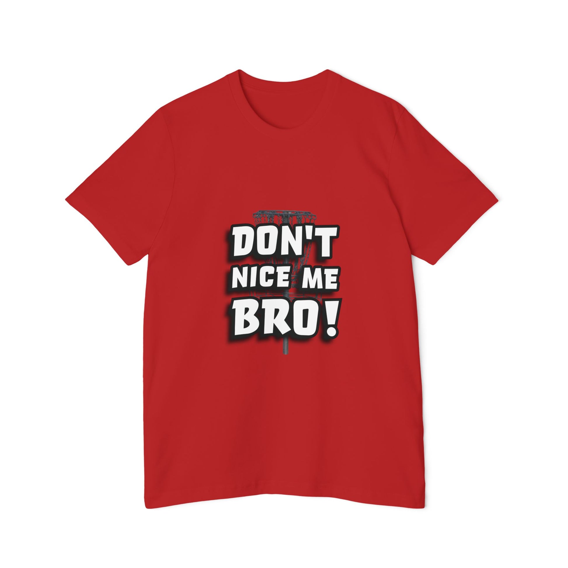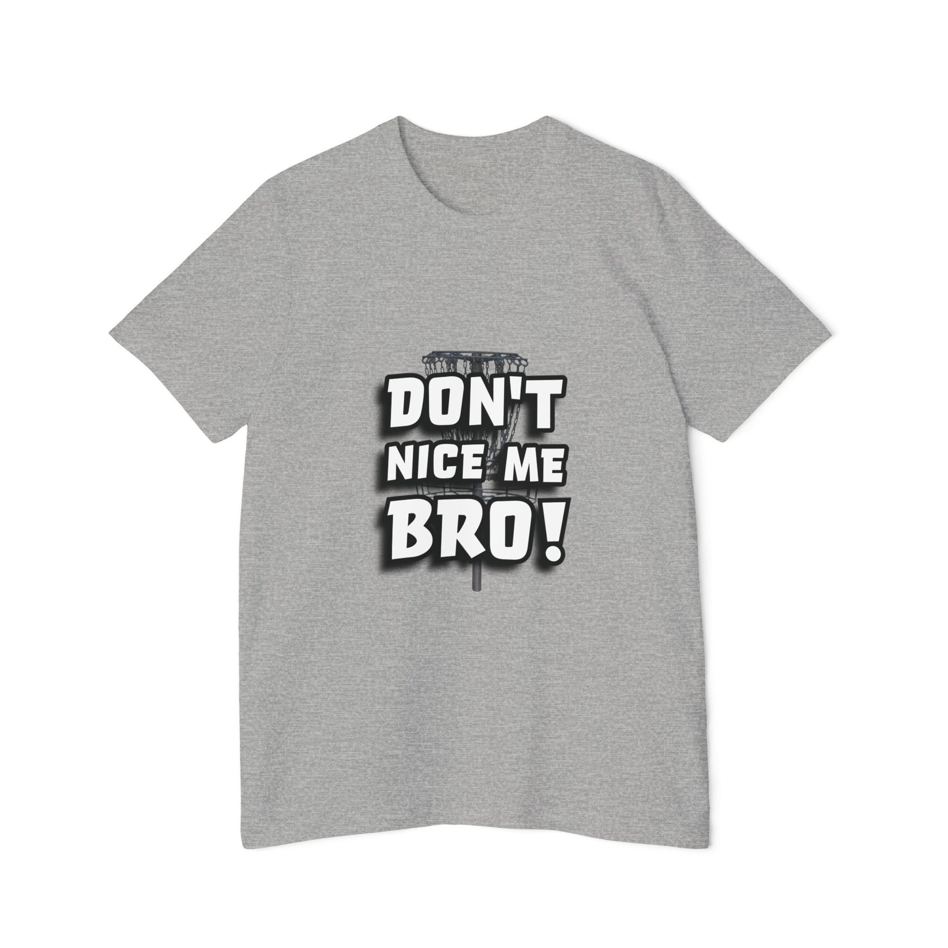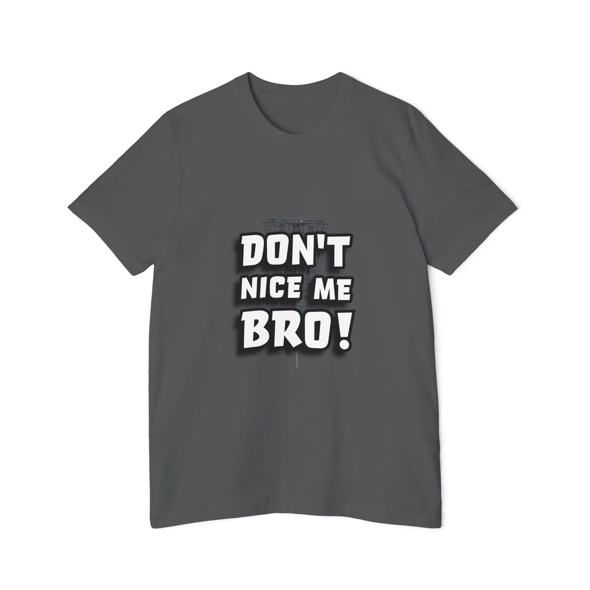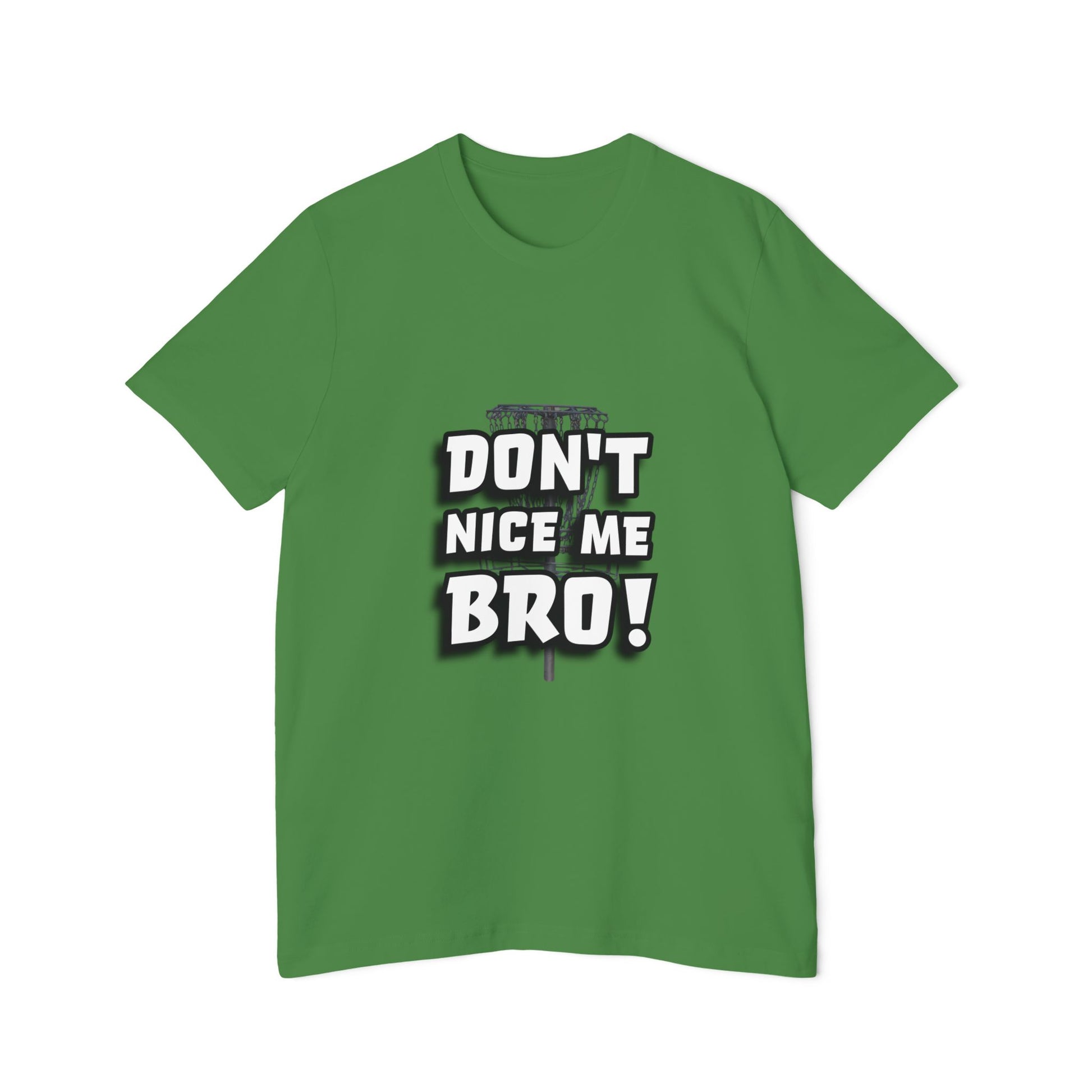 This tee brings disc golf humor front and center with the bold phrase “DON’T NICE ME BRO!” in large, stylized white and black lettering. A faint image of a disc golf basket adds subtle texture behind the words, giving it that on-the-course edge. Perfect for players who know the jinx is real, say “nice shot” too soon, and you might just curse it! A must-have for any disc golfer with a sense of humor.
