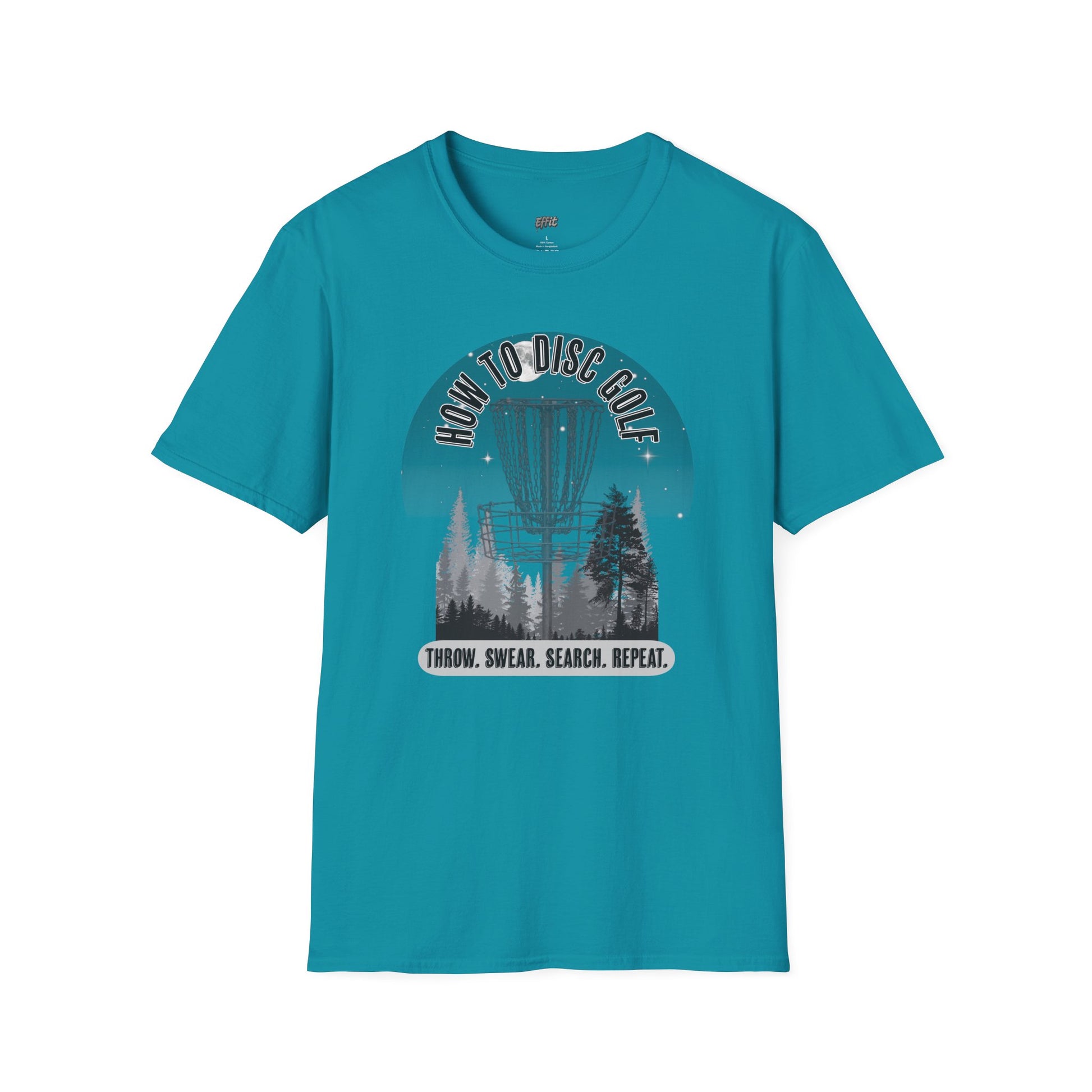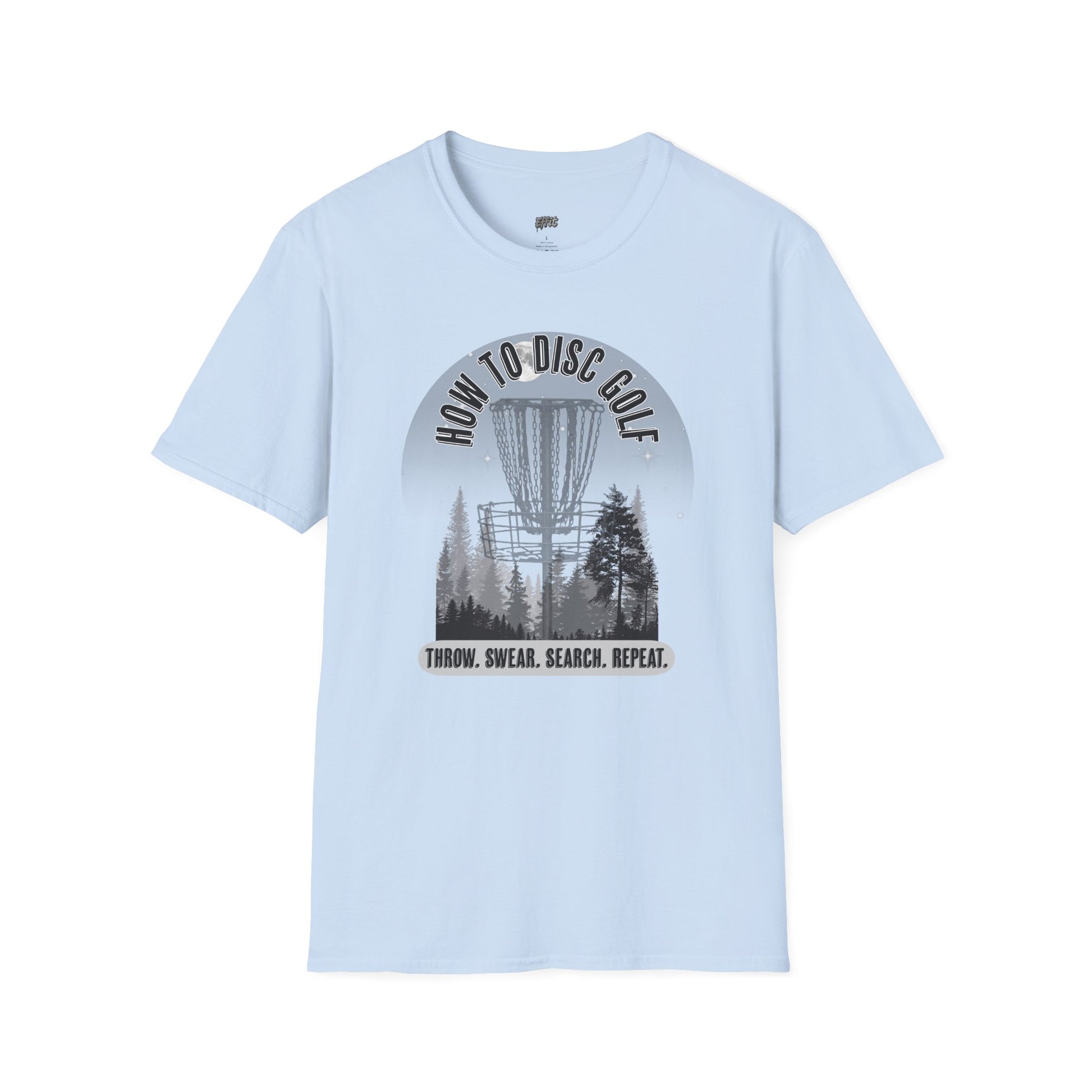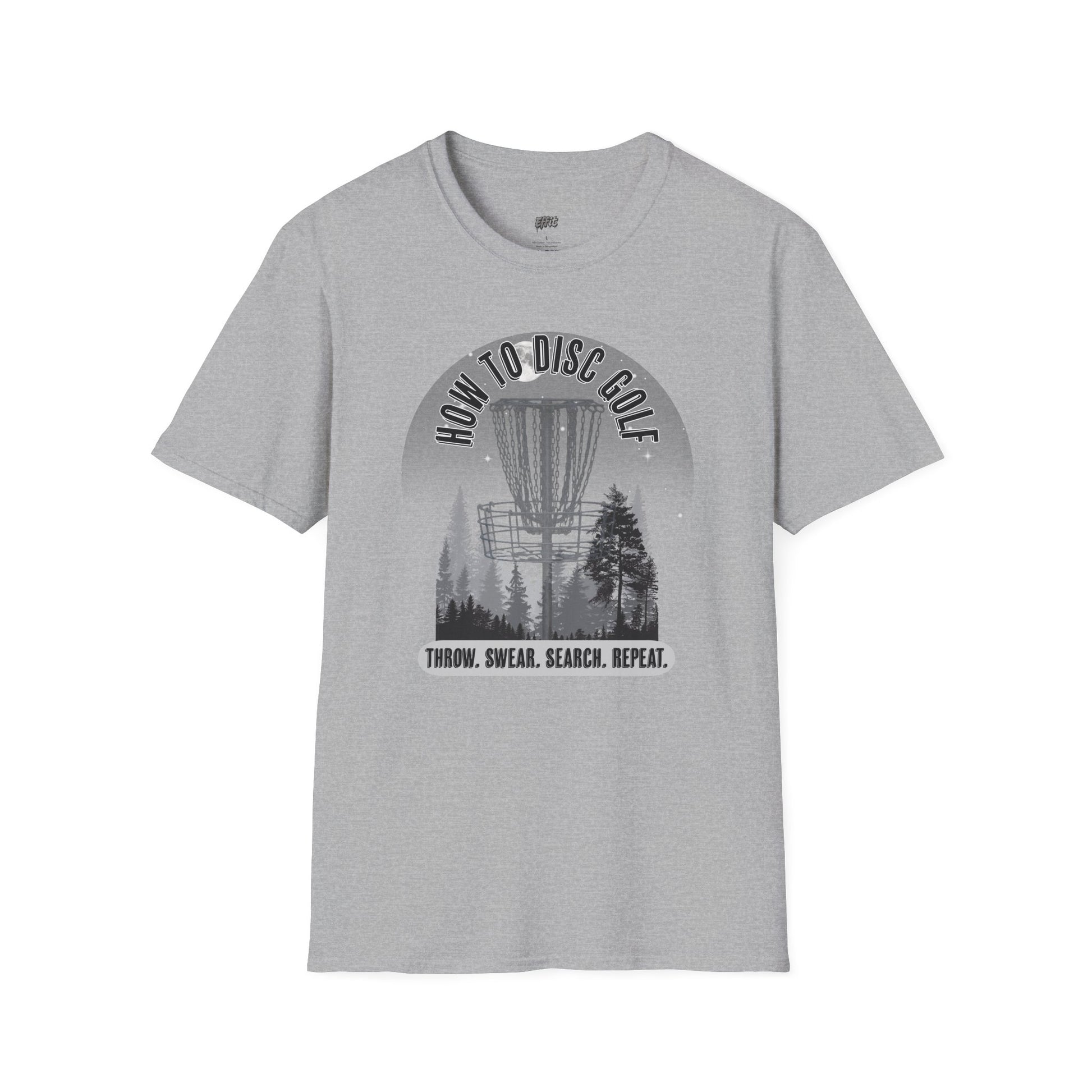 The design delivers a hilarious and relatable step-by-step guide for every disc golfer. Featuring a moody forest scene with a towering disc golf basket, the design is topped with the title HOW TO DISC GOLF and followed by the all-too-true sequence: THROW. SWEAR. SEARCH. REPEAT. With its grayscale artwork and tongue-in-cheek humor, the shirt is perfect for players who know the struggle and love the game anyway.