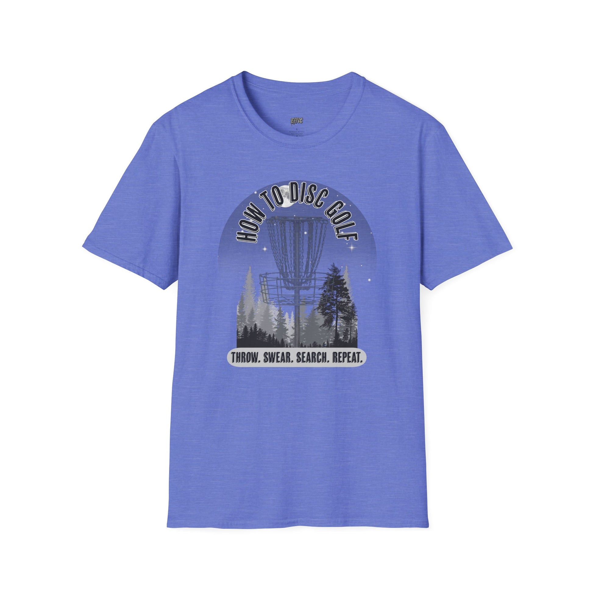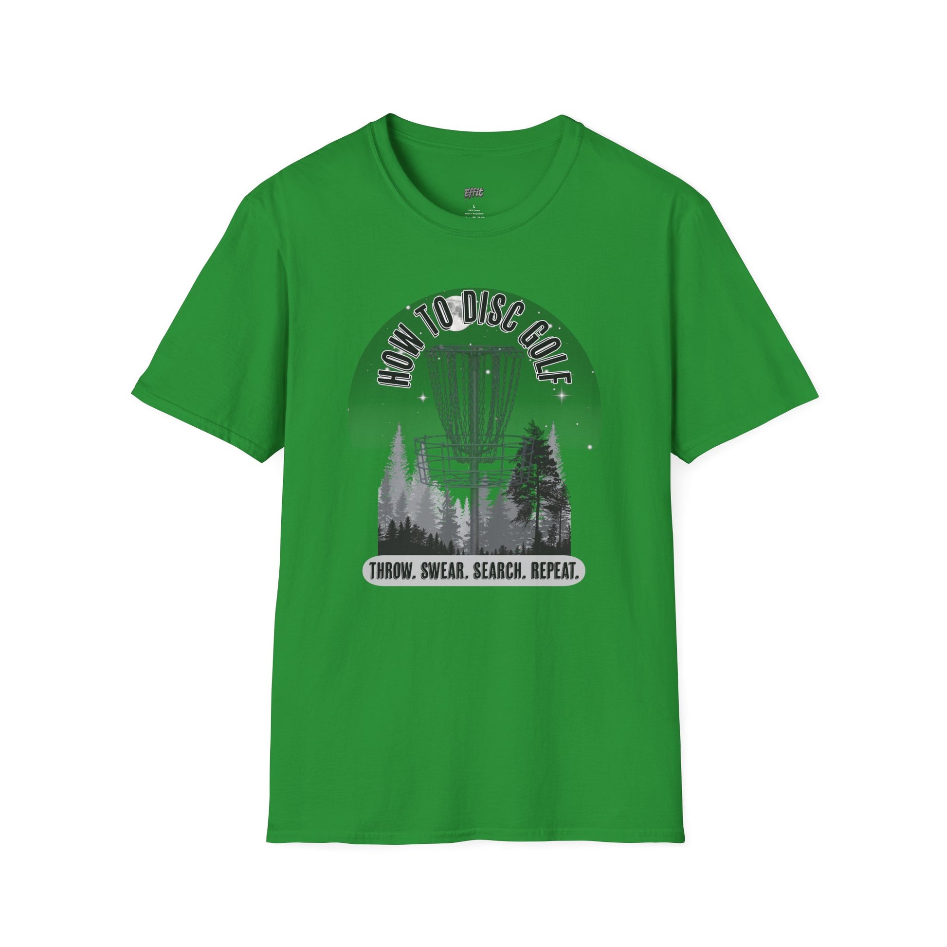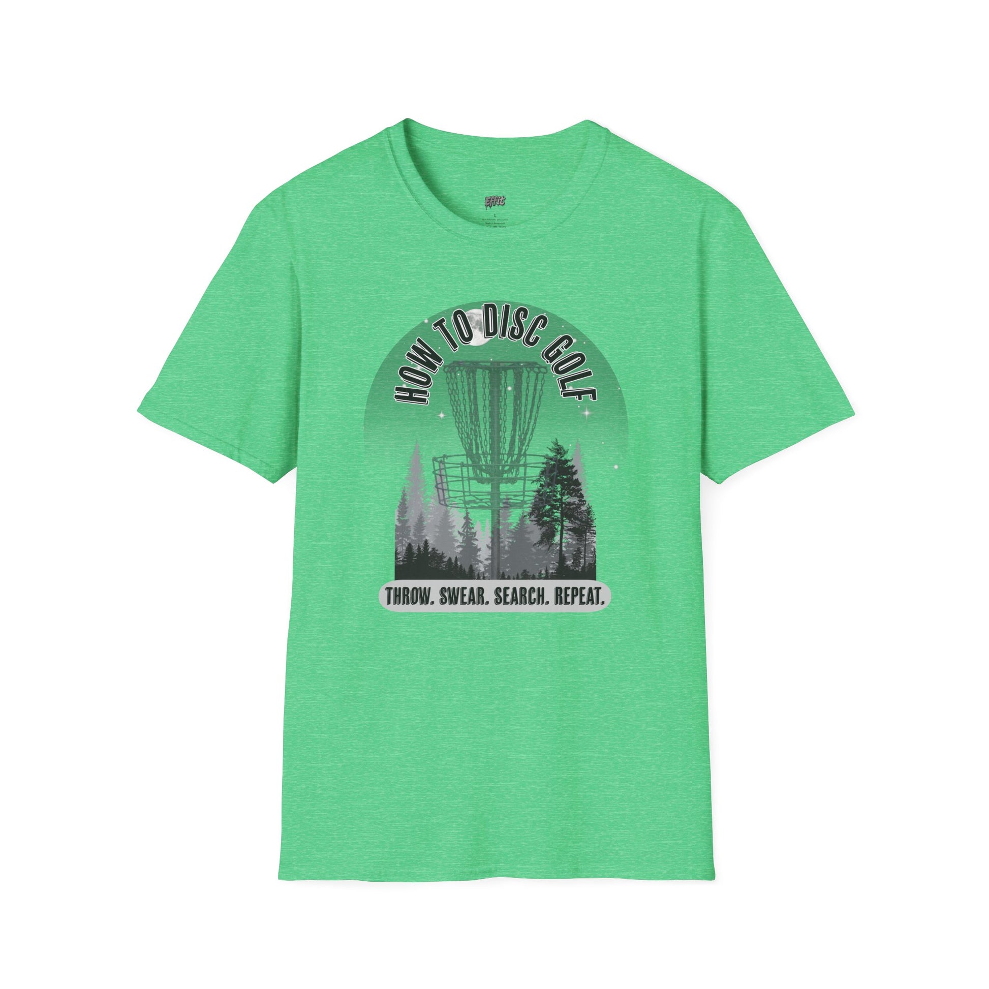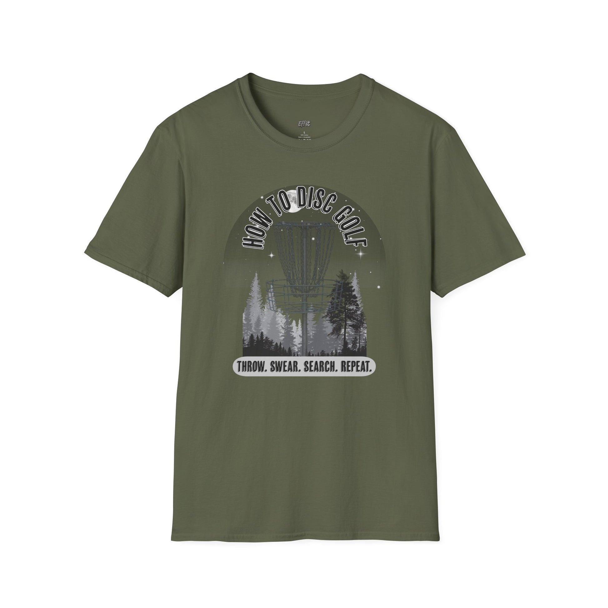 The design delivers a hilarious and relatable step-by-step guide for every disc golfer. Featuring a moody forest scene with a towering disc golf basket, the design is topped with the title HOW TO DISC GOLF and followed by the all-too-true sequence: THROW. SWEAR. SEARCH. REPEAT. With its grayscale artwork and tongue-in-cheek humor, the shirt is perfect for players who know the struggle and love the game anyway.