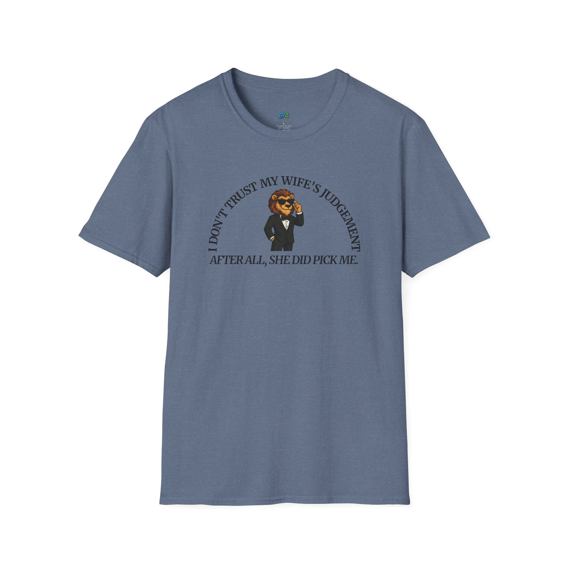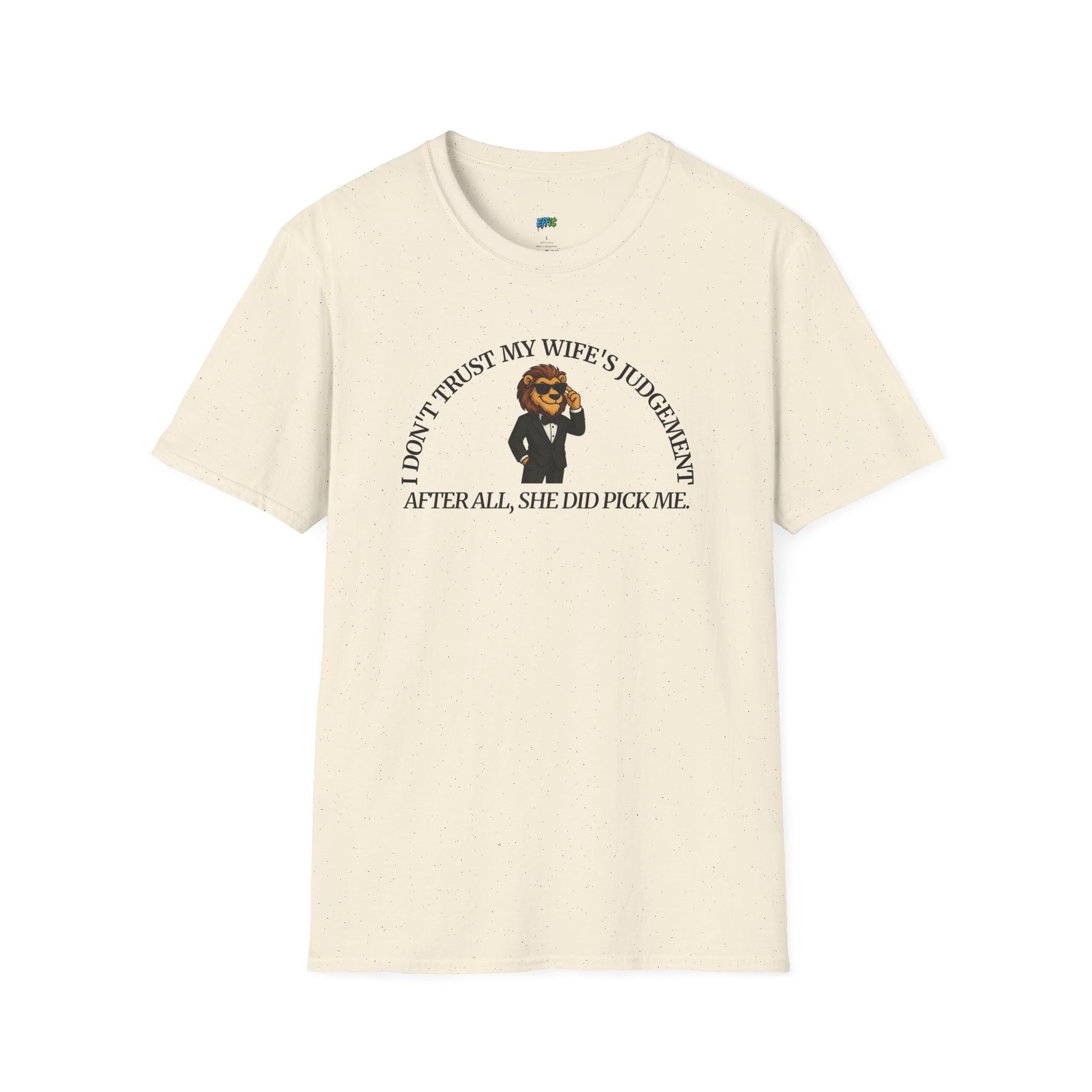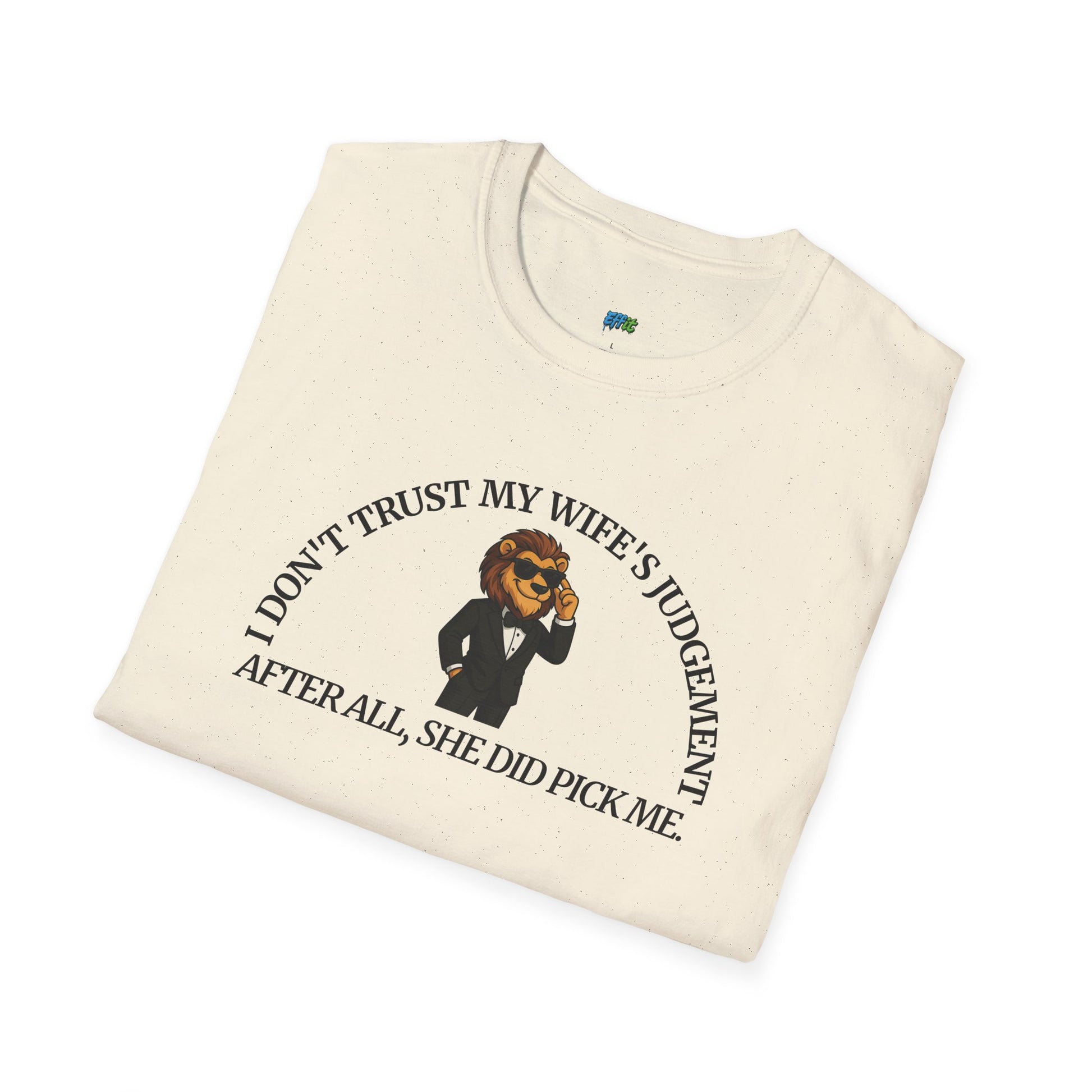 Suited up and dripping with charm, this dapper lion graphic pairs perfectly with the cheeky line: “I don’t trust my wife’s judgement… after all, she did pick me.” Whether you’re the lovable goofball or the king of self-deprecating humor, this tee delivers laughs and style in equal measure. A perfect gift for husbands who know they’re lucky, and aren’t afraid to admit it with a wink.