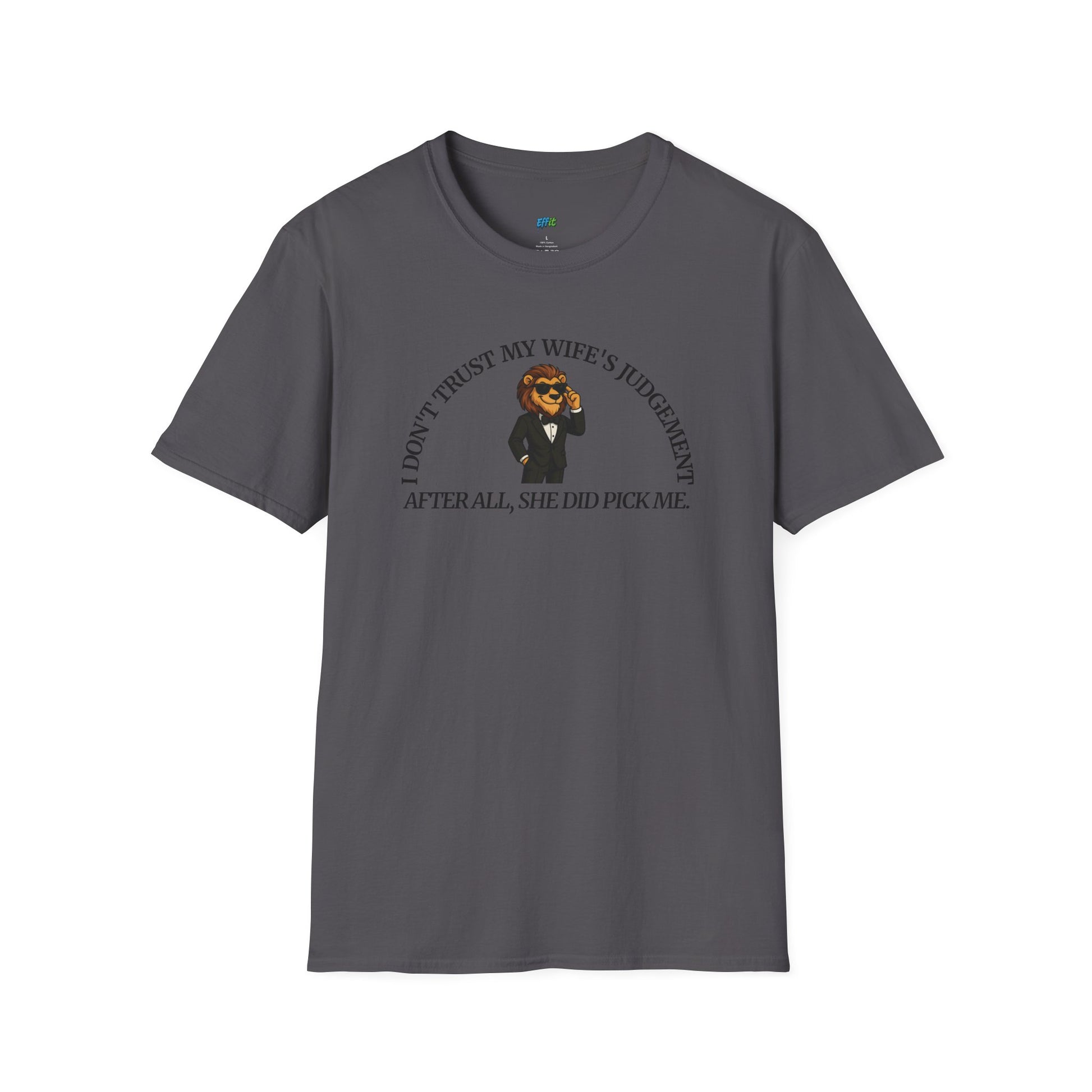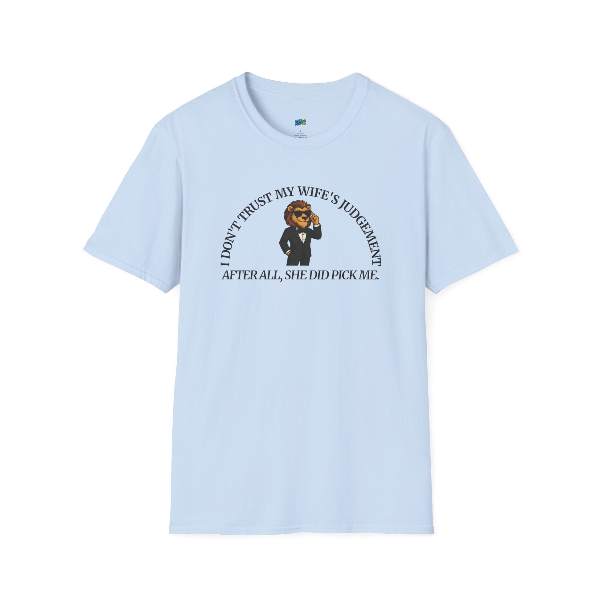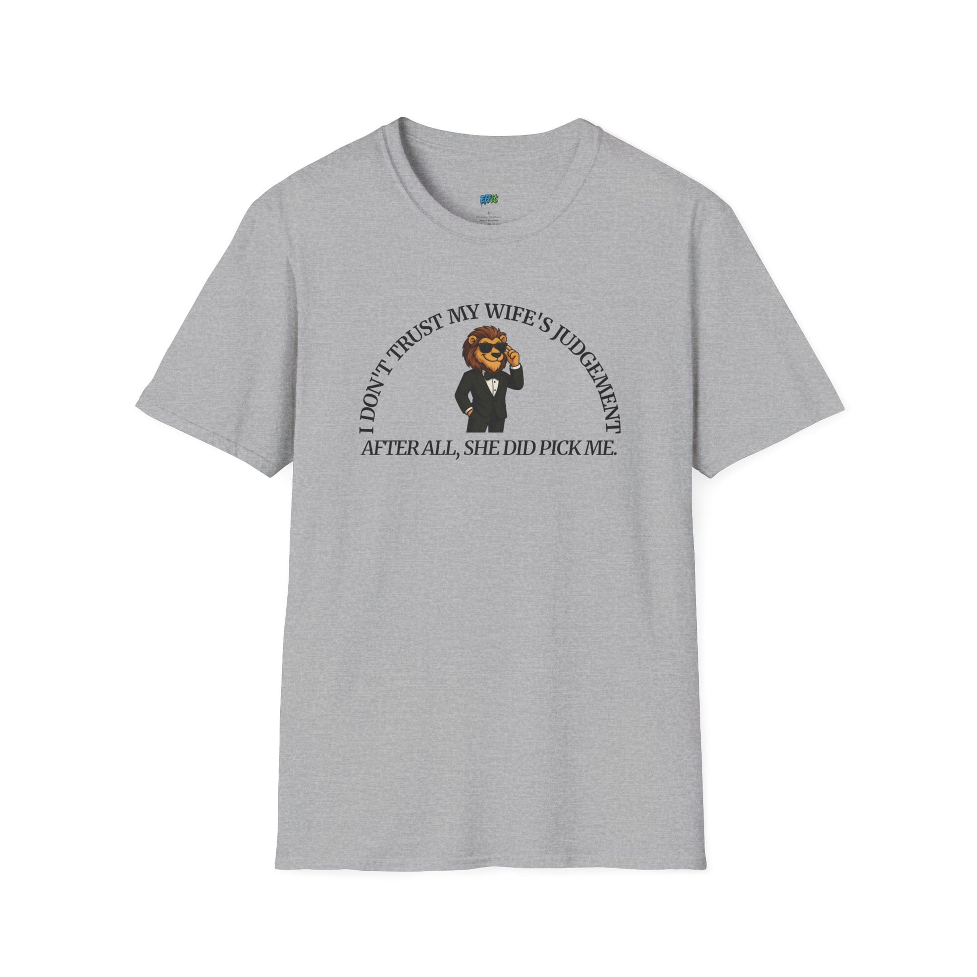 Suited up and dripping with charm, this dapper lion graphic pairs perfectly with the cheeky line: “I don’t trust my wife’s judgement… after all, she did pick me.” Whether you’re the lovable goofball or the king of self-deprecating humor, this tee delivers laughs and style in equal measure. A perfect gift for husbands who know they’re lucky, and aren’t afraid to admit it with a wink.